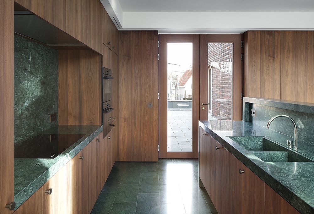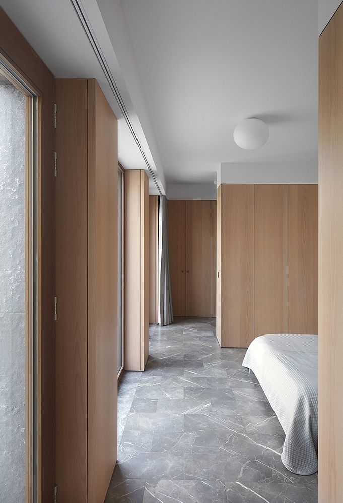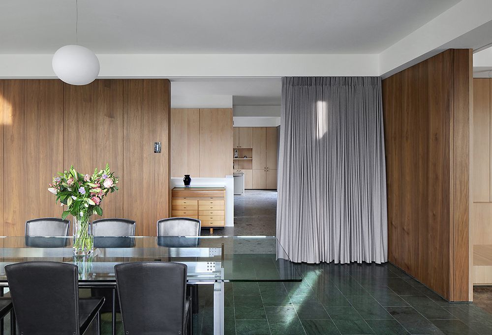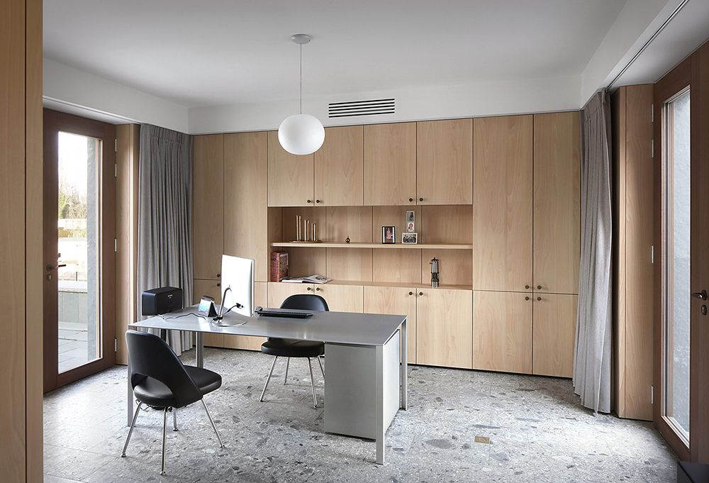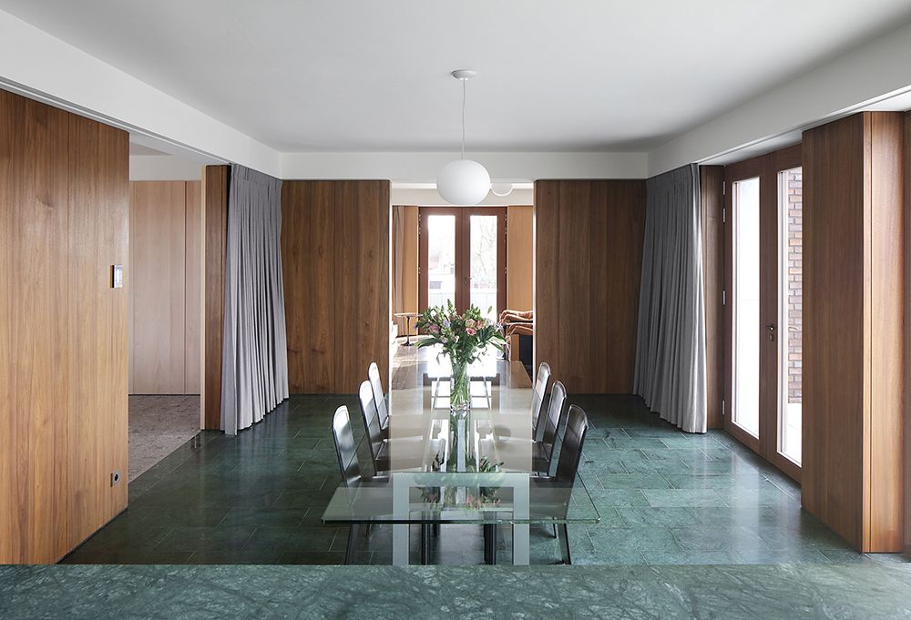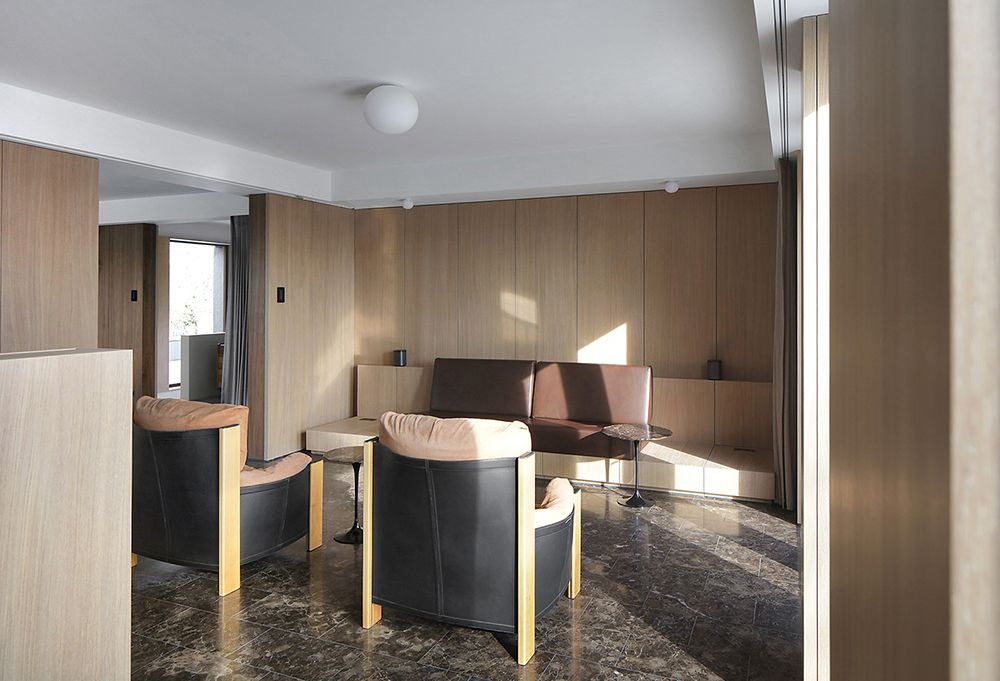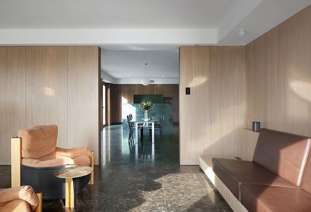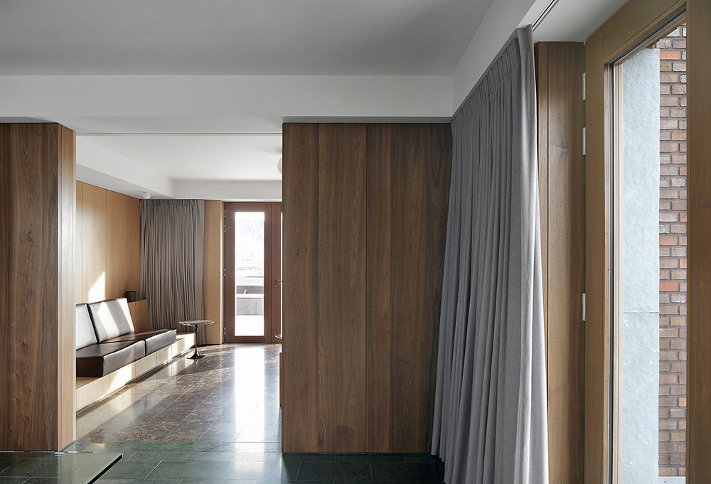 Each of the four distinctive living spaces (eat, relax, work, sleep) have a different material and color palette, as well in the marble floor finishing as in the wooden wall paneling and curtain fabric.