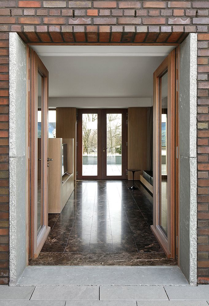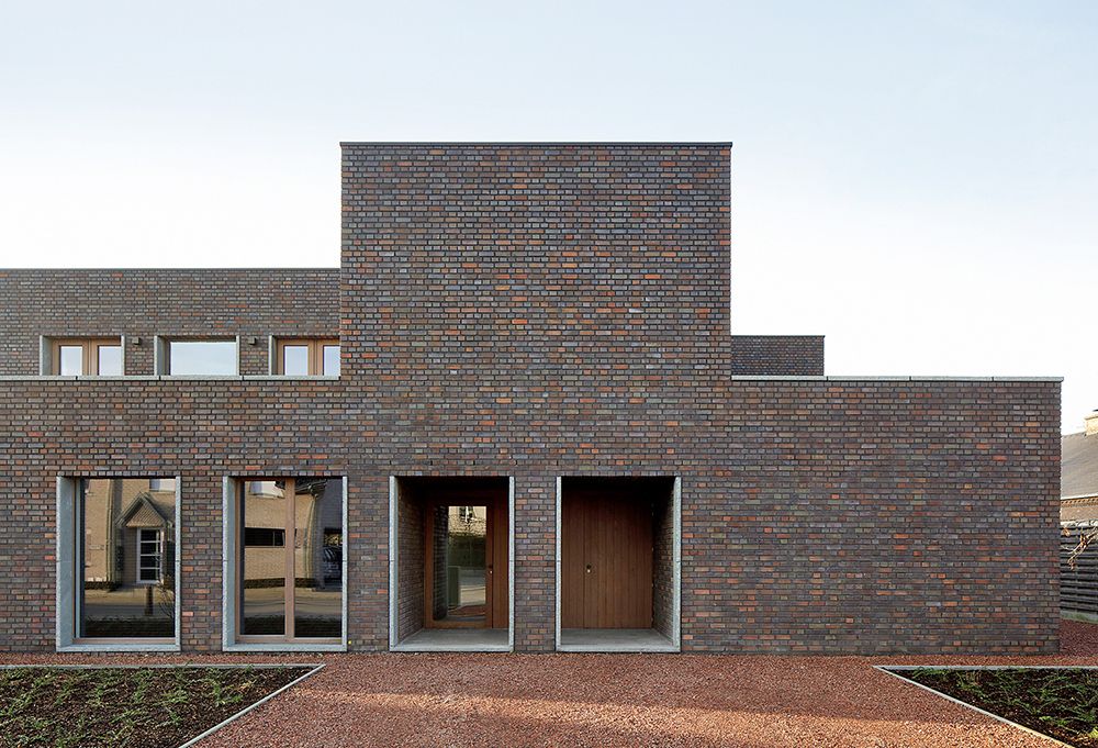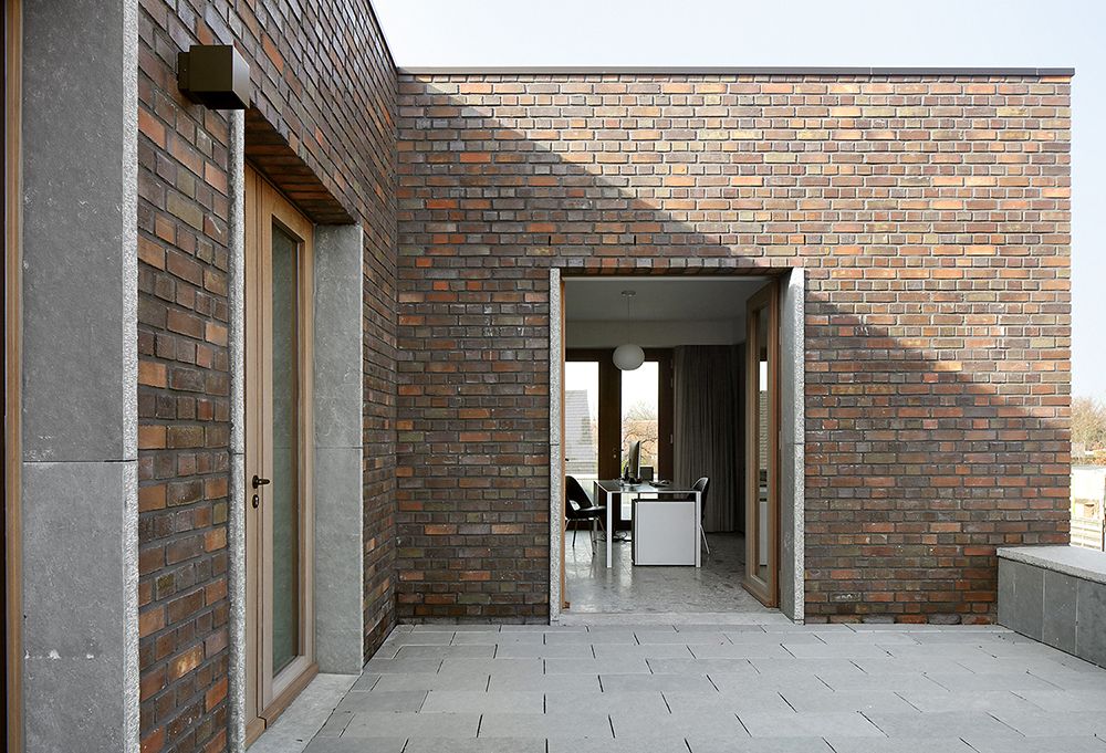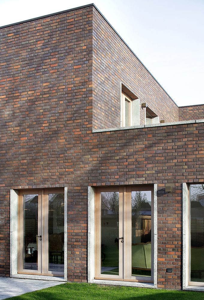 The building has concrete and blockwork loadbearing structure, brickwork in richly textured hand-selected dark red in standing bond. Windows in hardwood and terrace edges are articulated by a greenish natural stone edge detail.