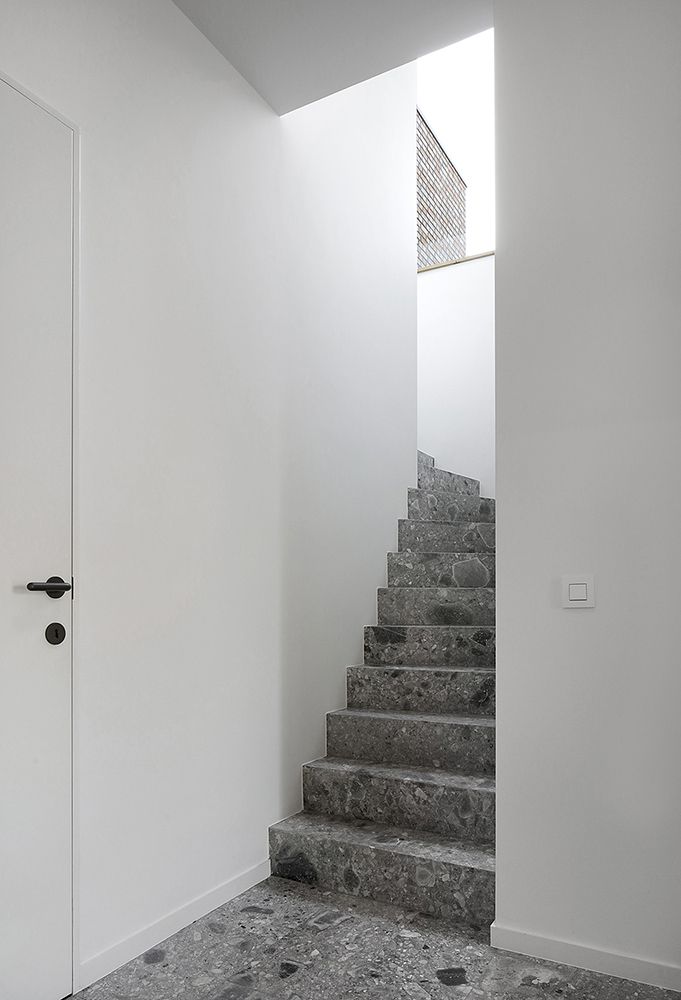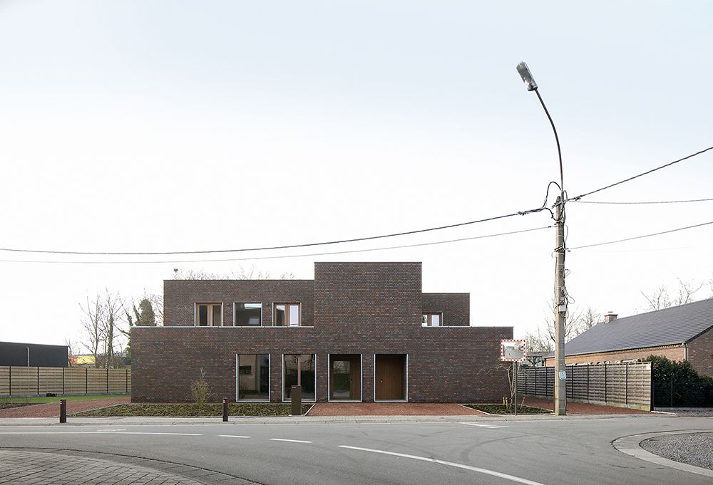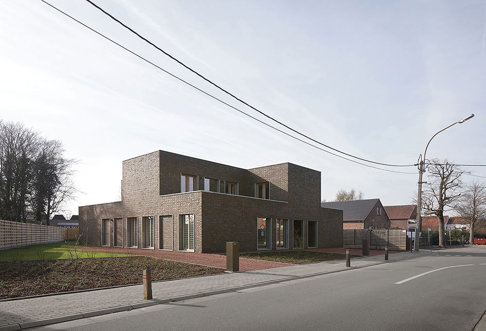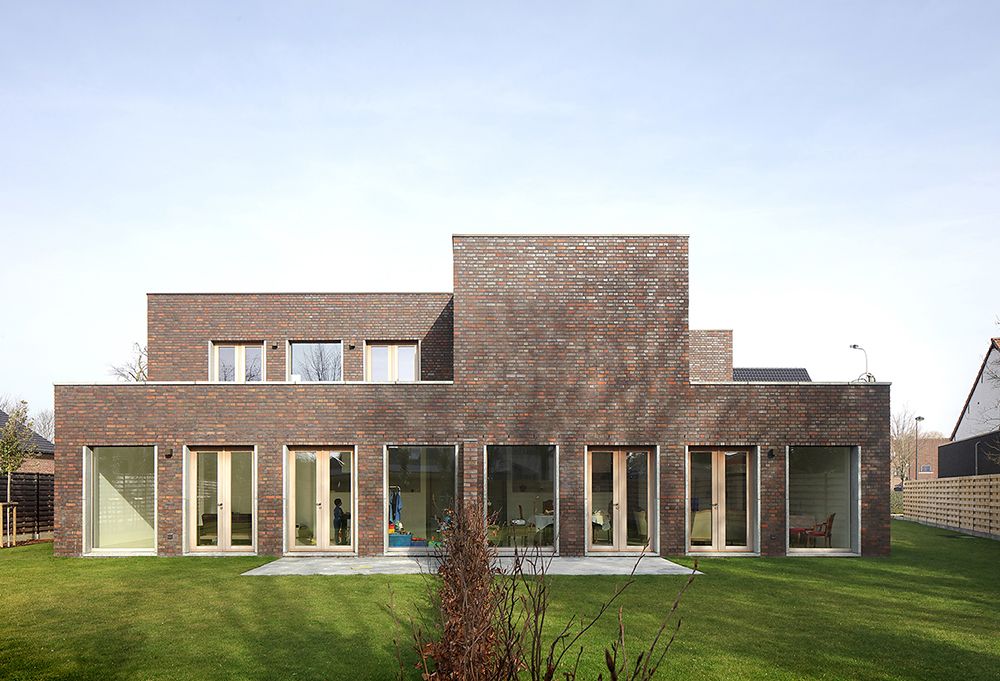 On a plot near the village centre of De Pinte, typically used for a detached house, Villa Aan De Bocht presents itself as a generous single-family house on two floor levels with a long fairly closed north facing street facade and a strict rhythm of window openings on the different elevations.